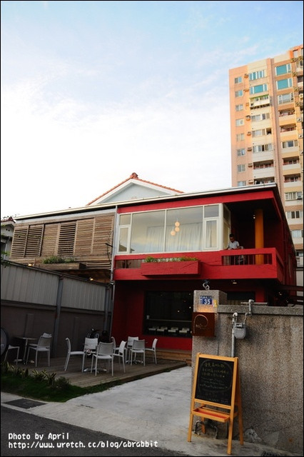 外頭有著紅色的鮮豔色系,配上外頭還有一大片草坪以及戶外的小桌椅。