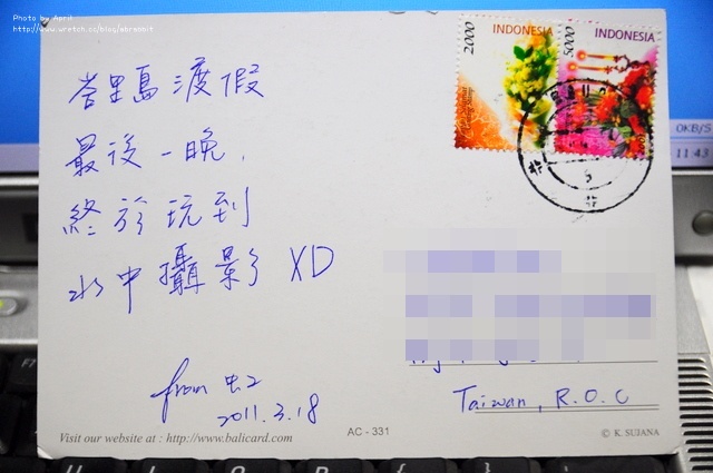 今年三月份,好友虹跑去峇里島度假,寄了這張明信片給我。