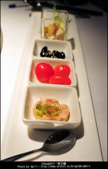 裡頭有紹興醉雞、梅汁蕃茄、黑豆與鮮筍梅凍四種小前菜。