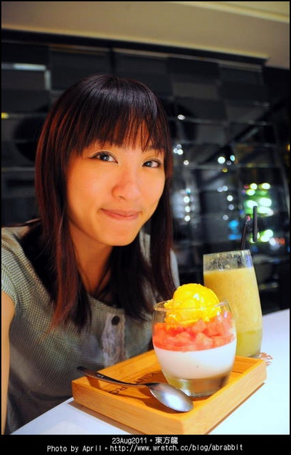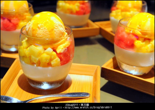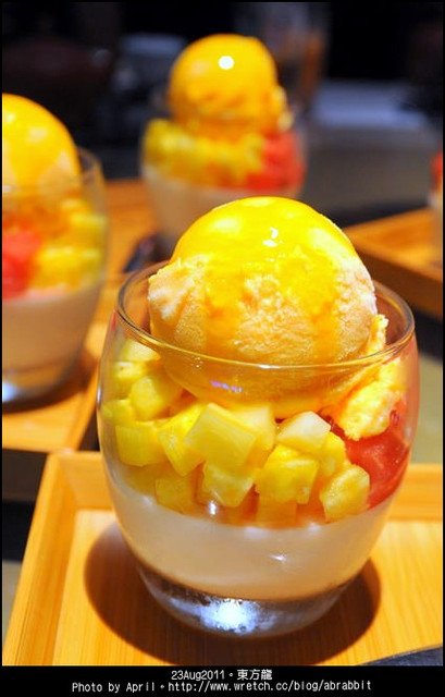 最上層是芒果冰淇淋配上芒果醬,中間則是鳳梨丁配上西瓜丁,
