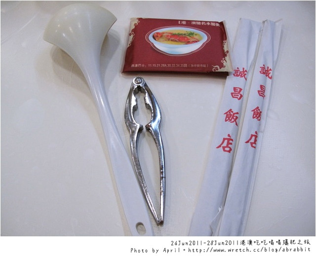 有舀粥專用的大湯匙、夾蟹殼的大箝子,筷子以及印有誠昌飯店的面紙。