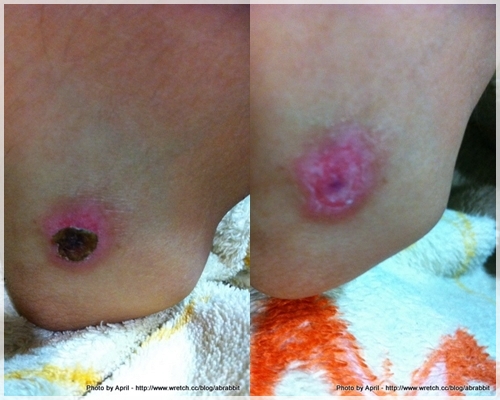 一兩週沒多久之後,手肘的傷口慢慢結痂,但是可以看得出來一旁還是很紅腫。