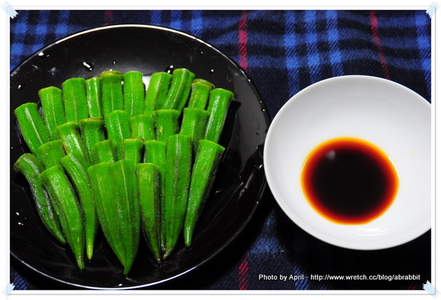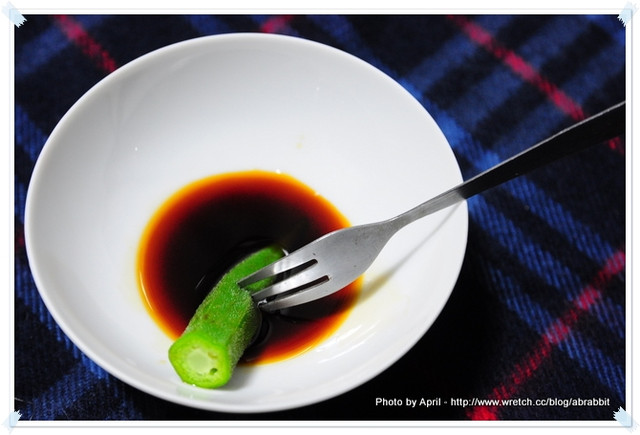 我們把水煮汆燙過後的秋葵,沾沾我們的天然手工醬油。