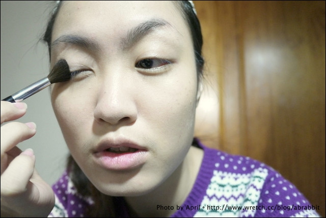 拿眼影大刷在眼窩上一層底色,通常是淺色的眼影。(有人會用珠光白或粉色系列)