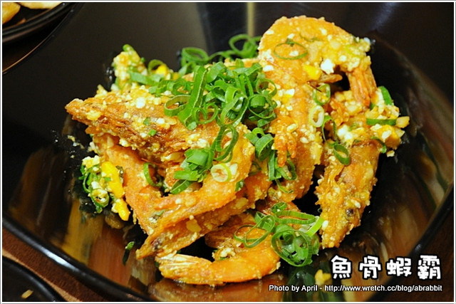這道蝦料理是用鹹蛋與蒜末拌炒而成的,