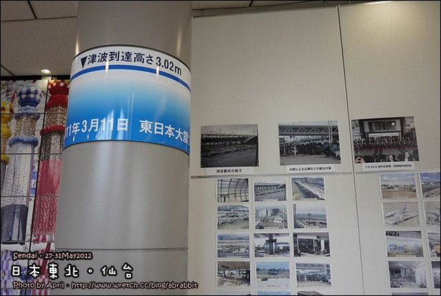 機場裡頭貼著當時海嘯襲捲到這兒的高度,