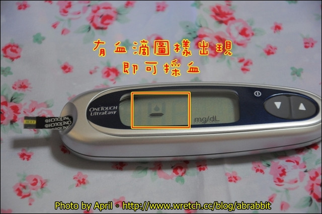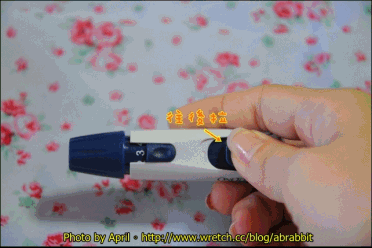 試紙會自己將血液吸入,所以記得血量要足夠,得一次就讓試紙充滿血,才能讀取血糖資料。