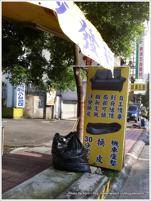 外頭寫著沙發換皮、機車座墊換皮的字。