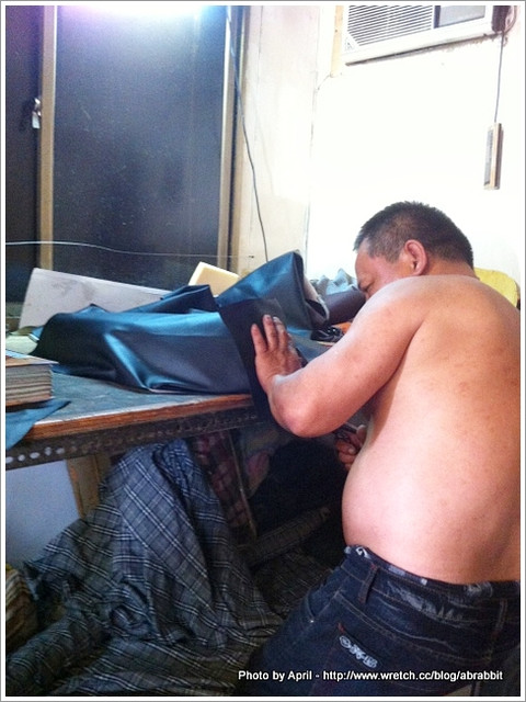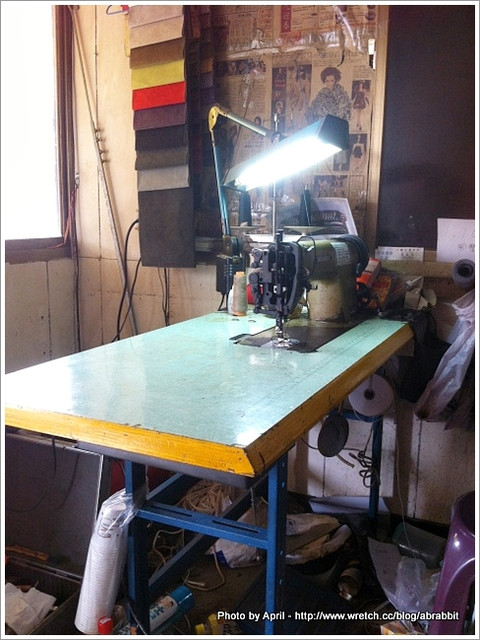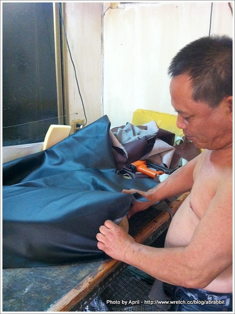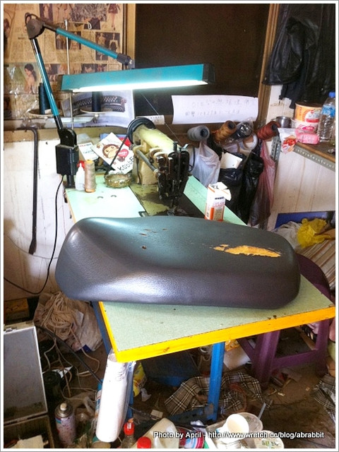 沒多久,老闆開始縫紉我的機車椅墊新皮。