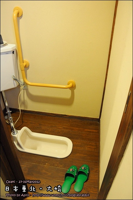 裡頭還有雙室內鞋,而且蹲式馬桶周圍的地板還是木式的。