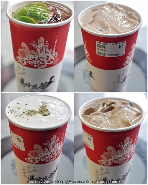 四杯飲料從左到右分別是:港式凍檸茶、絲襪奶茶、雪舞冰綠與鴛鴦奶茶。
