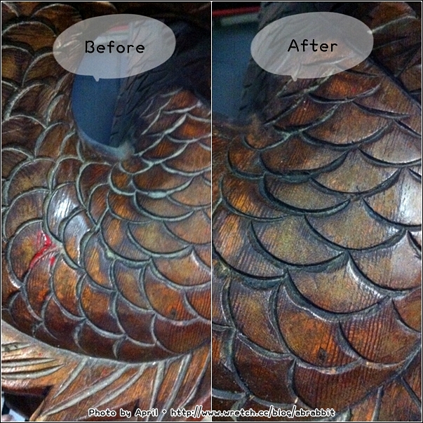 大概花了我一小時左右才把整隻木雕龍擦好,