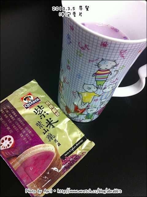 早餐喝一杯沖泡麥片,紫米口味的。