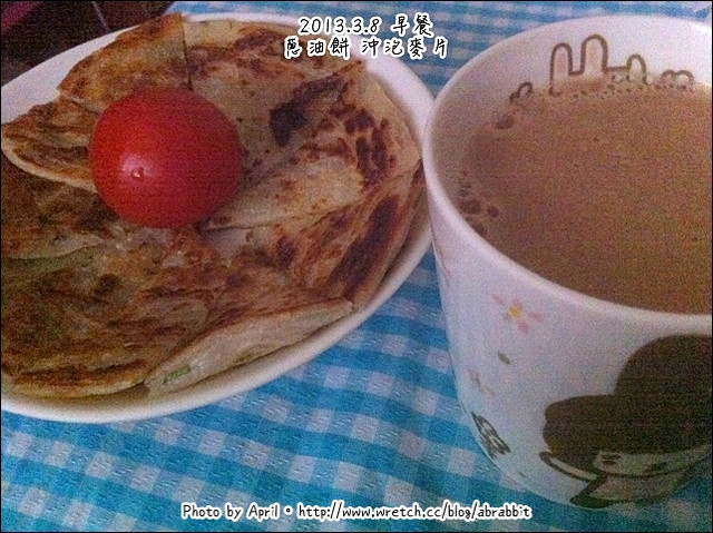 早餐吃沖泡麥片配上兔媽煎的蔥油餅。