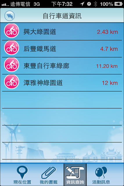 還有另外三條台中有名的自行車道:后豐鐵馬道、東豐自行車綠廊、潭雅神綠園道。