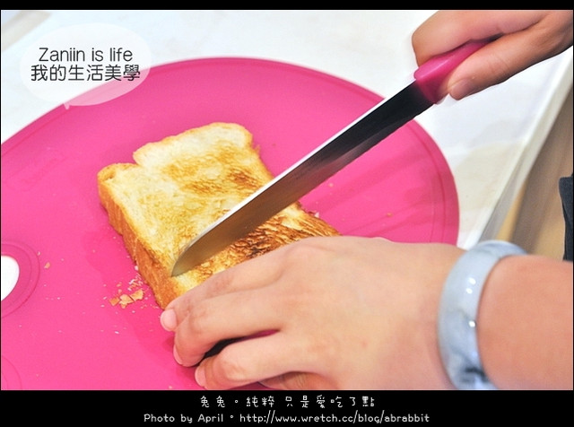因為手邊剛好沒有生肉可以切,就示範一下切土司好了!